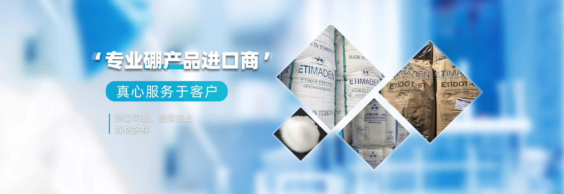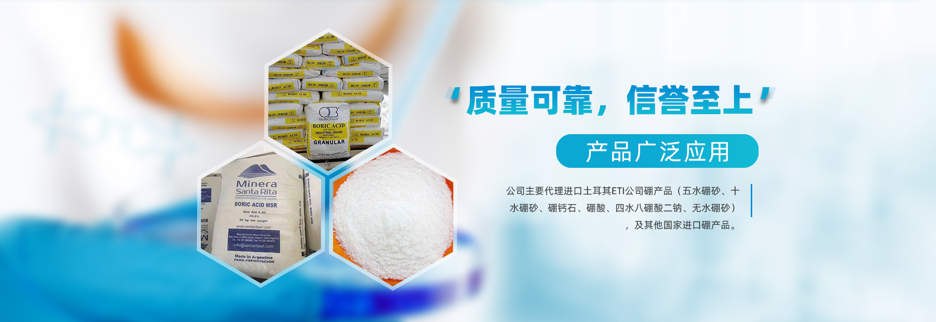 公司主要代理進(jìn)出土耳其ETI公司硼產(chǎn)品(五水硼砂、十水硼砂、速溶硼、硼鈣石、四水八硼酸鈉、無(wú)水硼砂), 及其他國(guó)家進(jìn)口硼產(chǎn)品。
